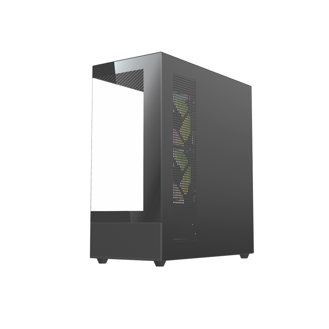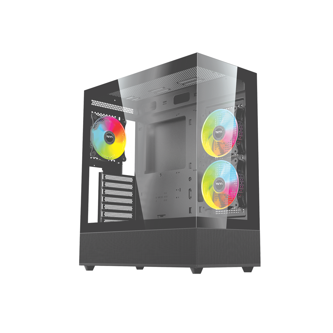 این کیس با پنل جلویی و سمت چپ از جنس شیشه تمپر کامل و سمت راست از جنس SPCC با پوشش مشکی پودری، جلوهای از ترکیب زیبایی و استحکام را به نمایش میگذارد.