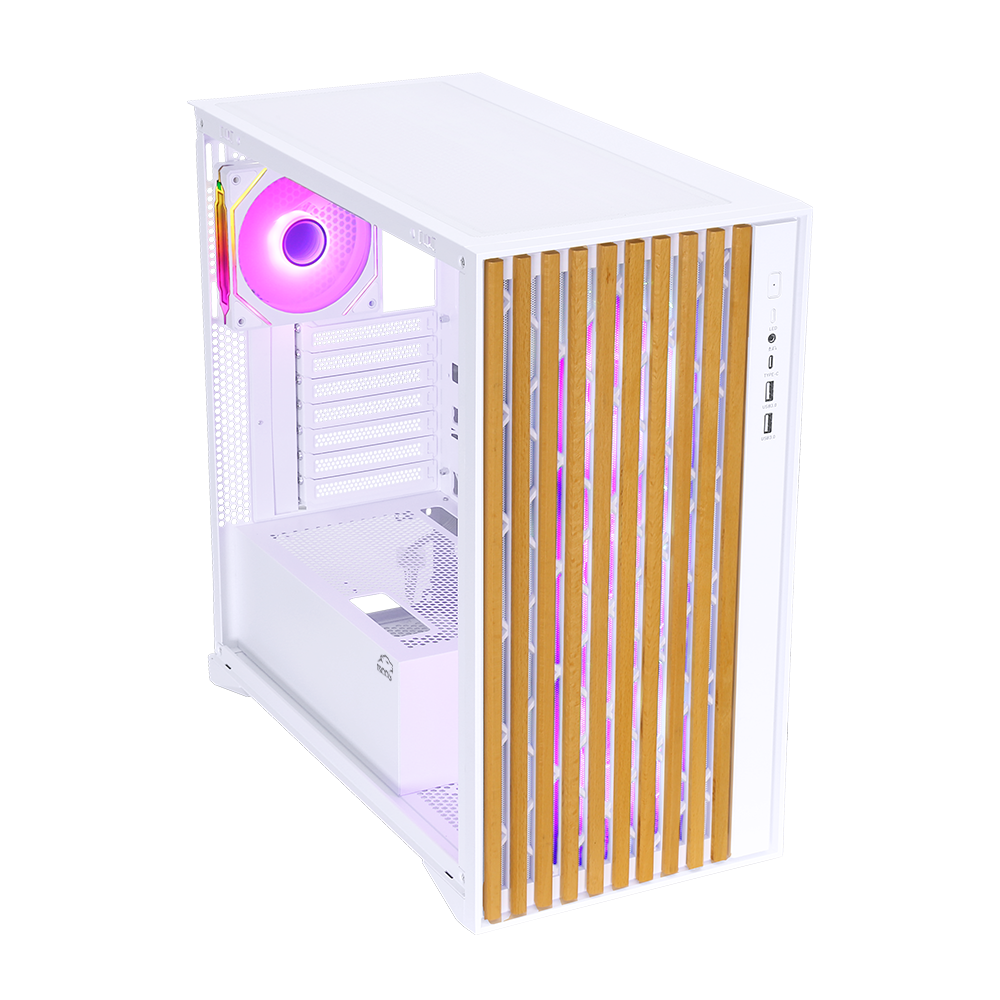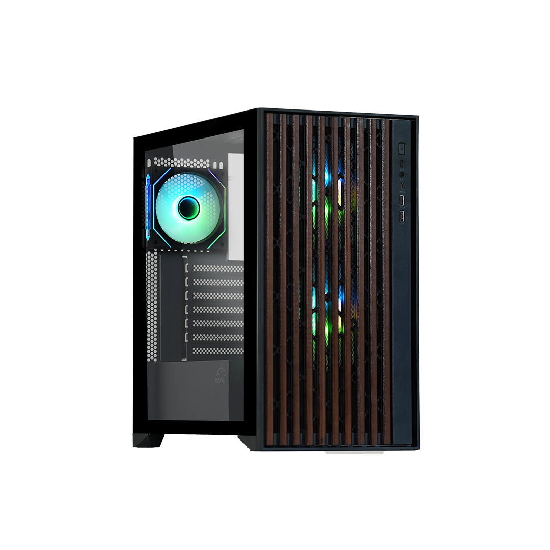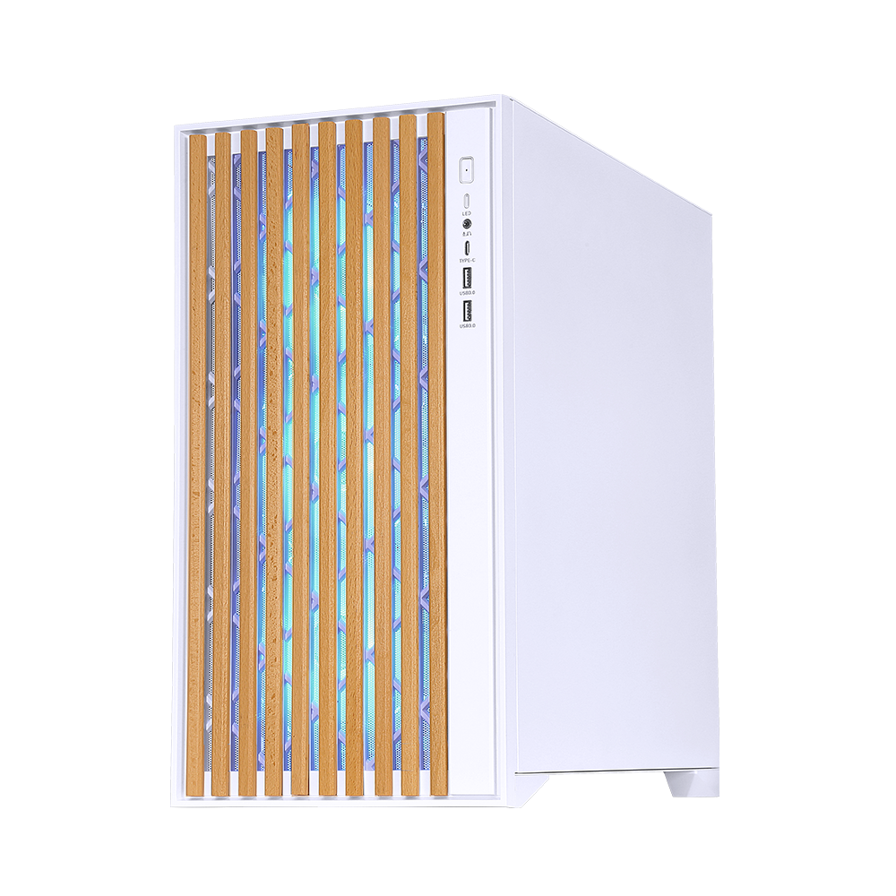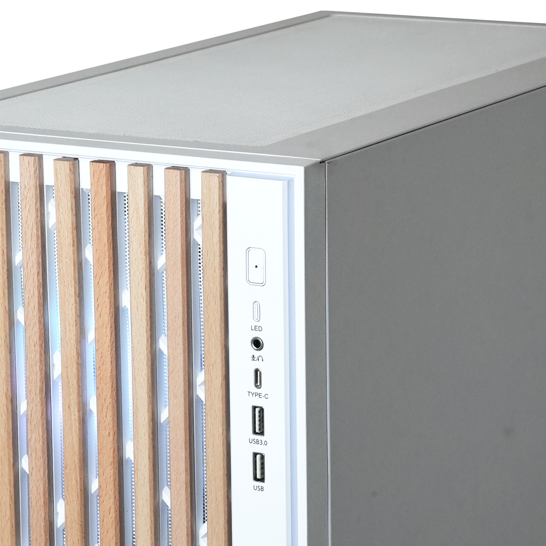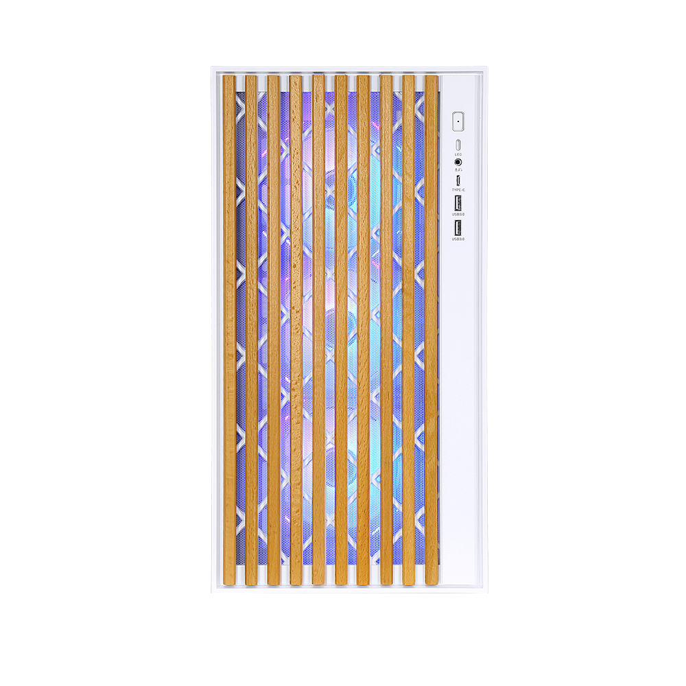 پنل جلویی چوبی شامل 1 پورت USB 3.0، 1 پورت USB 2.0، و 1 پورت Type-C می‌شه که اتصال سریع لوازم رو فراهم می‌کنه. پنل سقف بدون محدودیت ارتفاع، نصب خنک‌کننده مایع رو آسان می‌کنه. فن‌های ARGB، مثل شعله‌های زنده، نورپردازی رو از طریق مادربورد تنظیم می‌کنن و حس مینیمال چوبی رو با نورهای جذاب ترکیب می‌کنن.