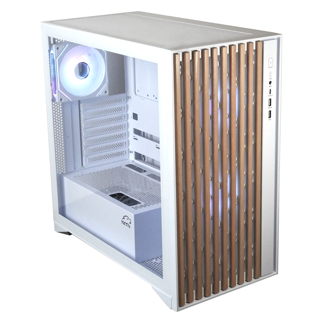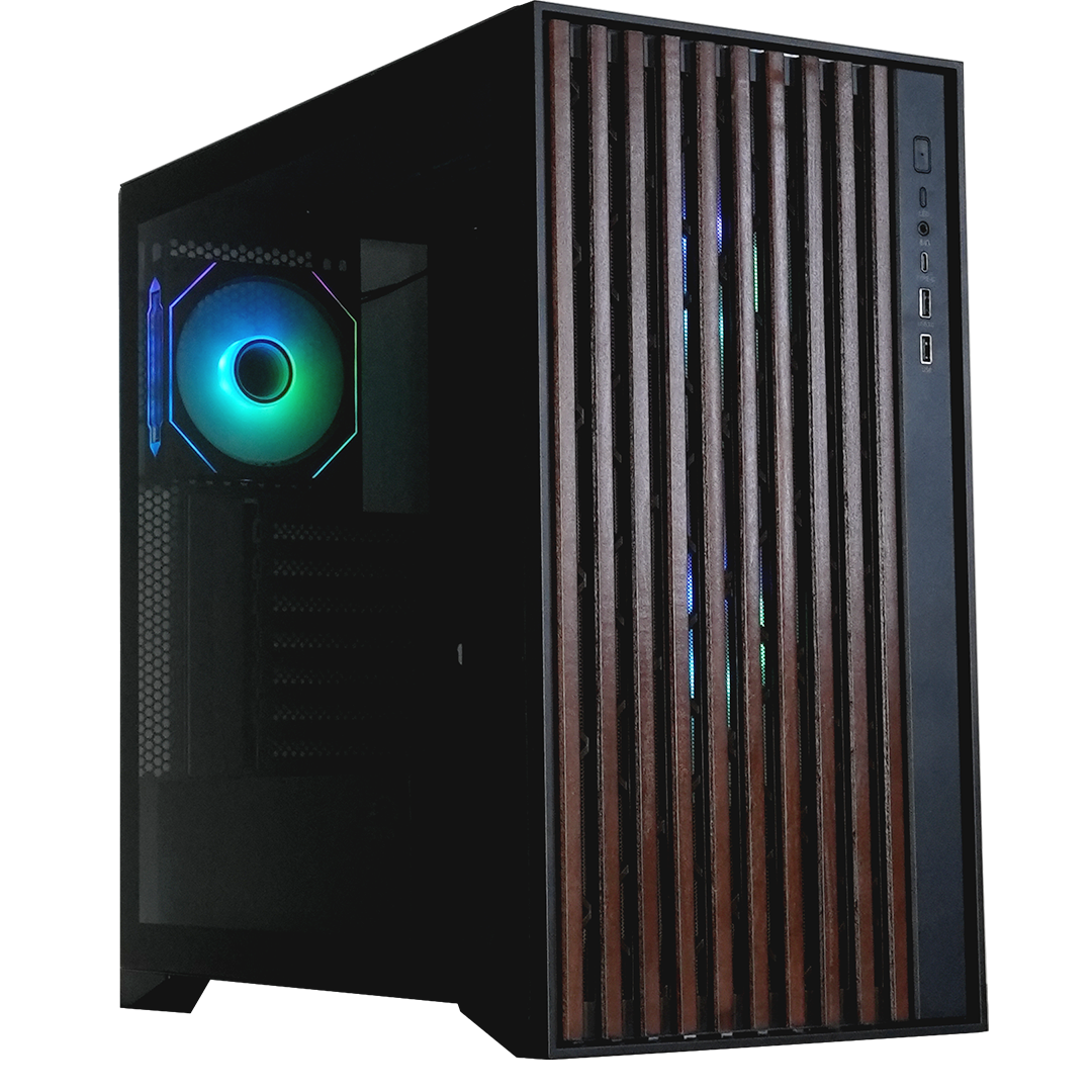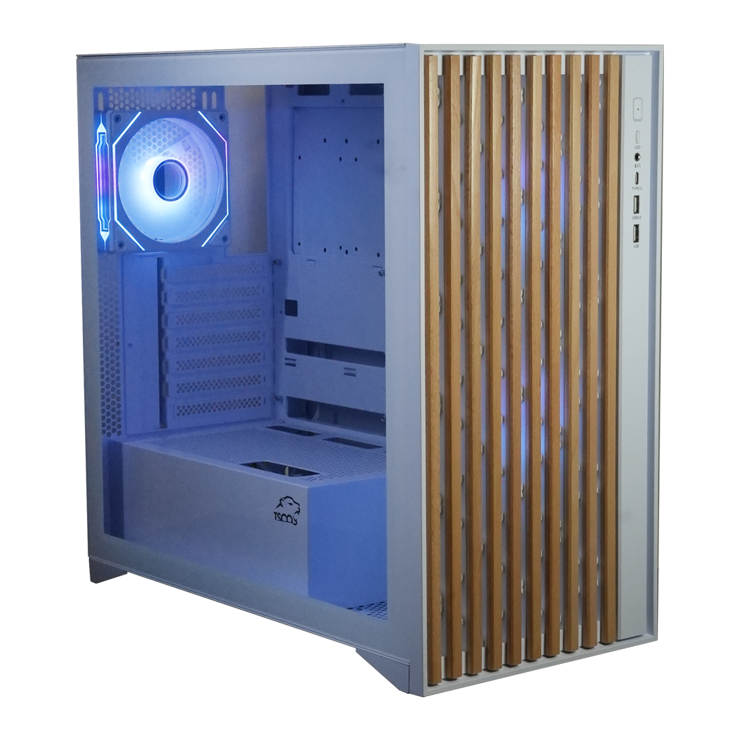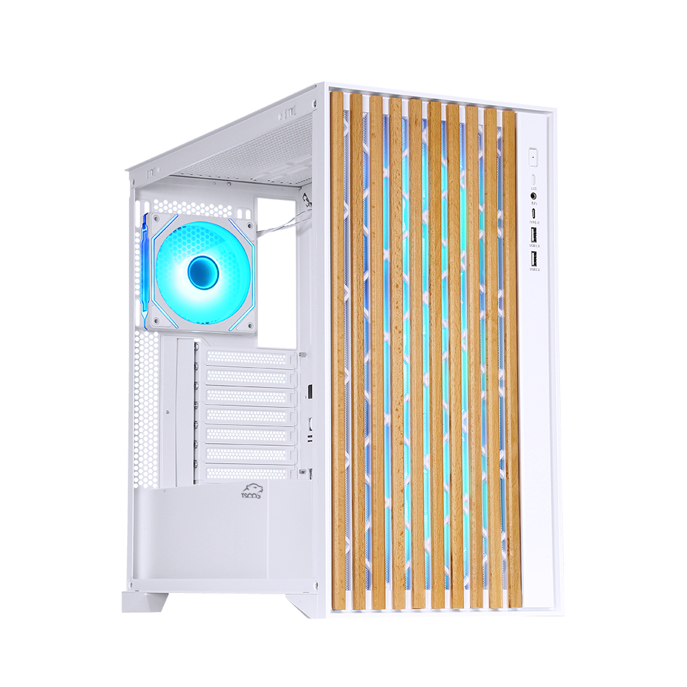پنل جلویی چوبی شامل 1 پورت USB 3.0، 1 پورت USB 2.0، و 1 پورت Type-C می‌شه که اتصال سریع لوازم رو فراهم می‌کنه. پنل سقف بدون محدودیت ارتفاع، نصب خنک‌کننده مایع رو آسان می‌کنه. فن‌های ARGB، مثل شعله‌های زنده، نورپردازی رو از طریق مادربورد تنظیم می‌کنن و حس مینیمال چوبی رو با نورهای جذاب ترکیب می‌کنن.