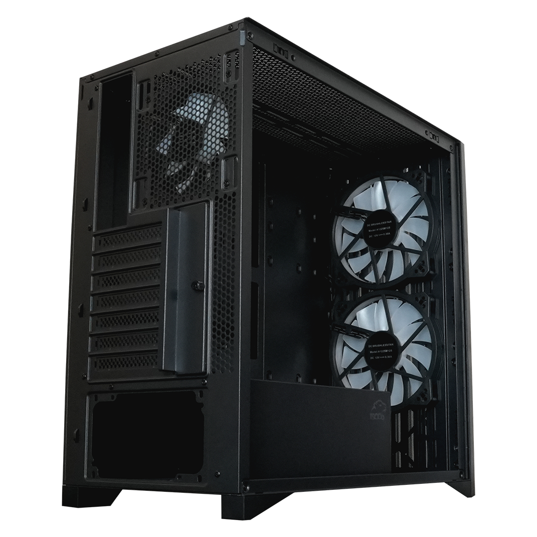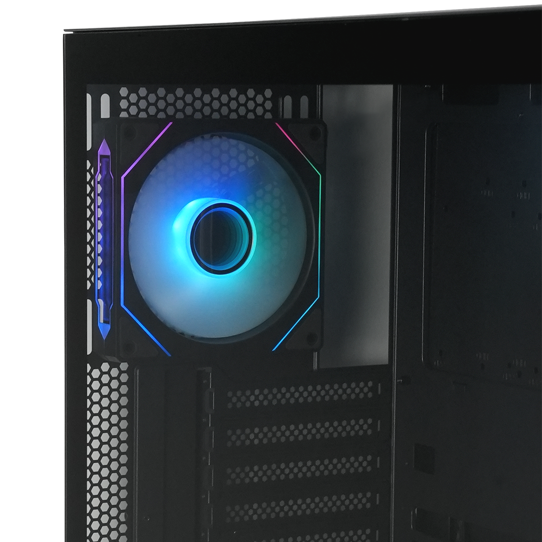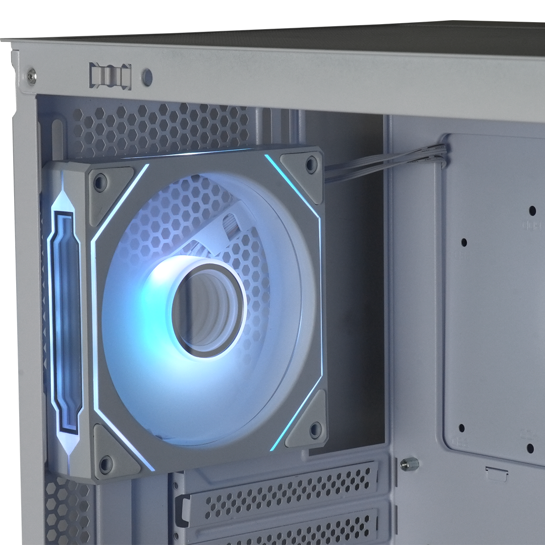 ۳ فن ARGB پیش‌فرض (۲×۱۶۰ میلی‌متری جلو و ۱×۱۲۰ میلی‌متری عقب) جریان هوای قوی و نورپردازی خیره‌کننده‌ای ایجاد می‌کنن. این فن‌ها از طریق مادربورد قابل تنظیم برای سرعت و نورپردازی هستن. هاب فن پیش‌فرض پشت کیس، امکان اتصال فن‌های اضافی رو فراهم می‌کنه و کنترل تهویه رو به سطح حرفه‌ای می‌رسونه.