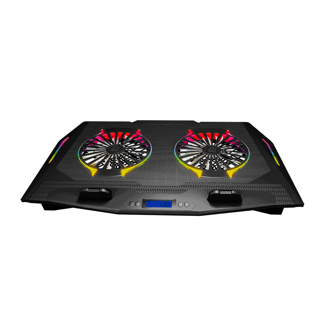 مناسب لپ تاپ های تا 17 اینچ / دارای دو فن 6 سرعته ی 125 میلی متری (ماکزیمم سرعت 1450RPM) / 7 حالت RGB / پنج حالت تغییر ارتفاع / دارای هولدر موبایل / دارای 2 پورت USB و نمایشگر و 5 تنظیم ارتفاع