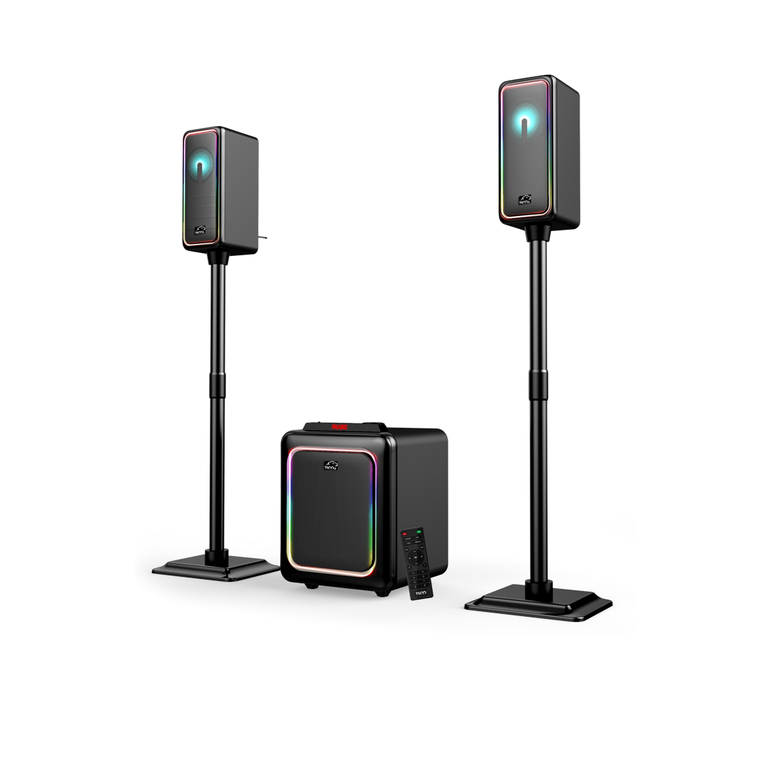 سته لایتها یا پایههای اطراف این اسپیکر هر یک مجهز به ساب ووفرهای 3 اینچی هستند. شما میتوانید یا بهصورت قدی یا بهصورت رومیزی از این سته لایتها استفاده کنید. برای استفاده در حالت رومیزی، پایههای این دو سته لایت را جدا کرده و آنها را در مکان دلخواه خود قرار دهید. بهعلاوه این اسپیکر حرفهای گیمینگ برای گیمرهای حرفهای شخصی سازه شده است تا بتوانند بهراحتی بیس و تریبل آن را نسبت به نیاز خود شخصیسازی کنید.